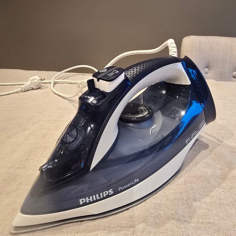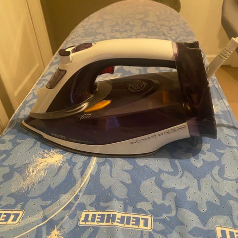 Philips EasySpeed dampstrykejern i lilla og hvit farge. Utstyrt med justerbar temperaturkontroll og dampfunksjon for effektiv stryking. Egnet for daglig bruk på ulike tekstiler.