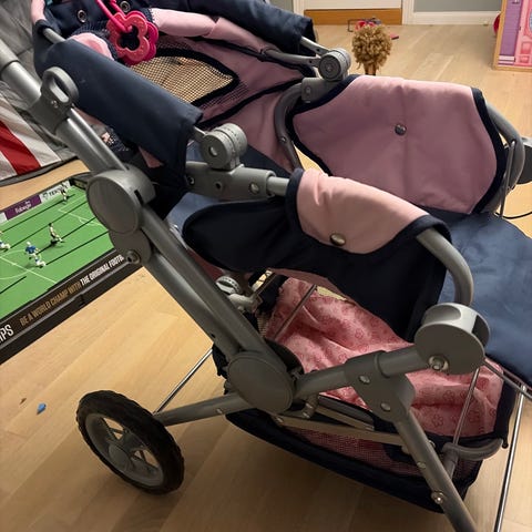 Dokke vogn, omtrent 40 cm høy. Kan brettes sammen.
