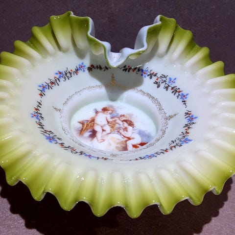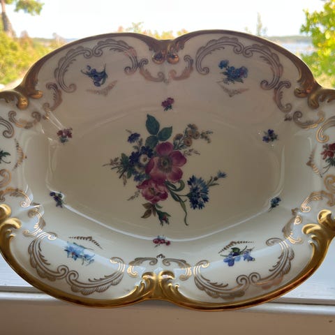 SELGER ET ANTIKT OG PRAKTFULLT FAT MED ENESTÅENDE VAKKER HÅNDMALT BLOMSTERDEKOR.