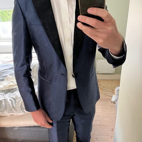 Brukt én gang. Smoking fra Dressmann, jakke i størrelse 50R og bukse i størrelse 36-30. Skjorte fra Eton i størrelse 40.
