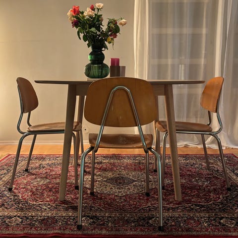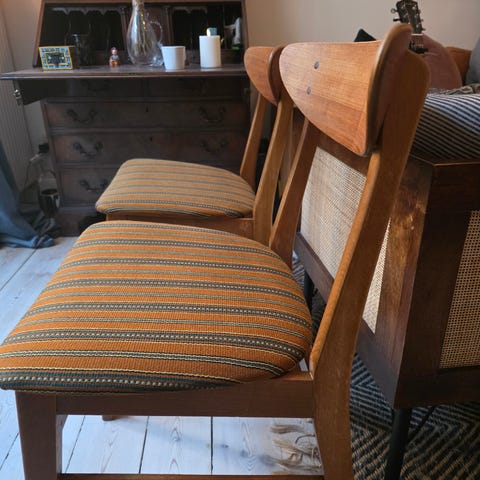 Godt- og fint brukte teak spisestoler fra danske Farstrup selges gjerne samlet kr 600,- pr stk, for alle 3 kr 1500,-