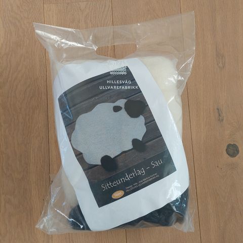Innmaten er litt klumpete, så må muligens sprettes opp for evt å få jevnet det. Sikkert ypperlig til bruk i vogn, eller til sitteunderlag ute. Ull er for dyrt til å kastes.