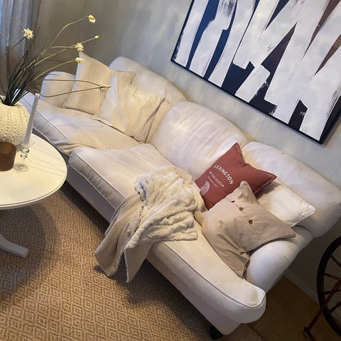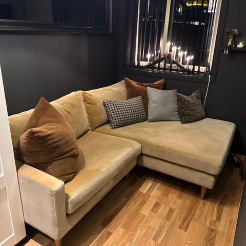 En stearinflekk på høyreside (når man sitter i sofaen) ellers ingen synlige flekker, og må hentes raskt - selges derfor billig. Helst så tidlig som mulig eller ila uka.