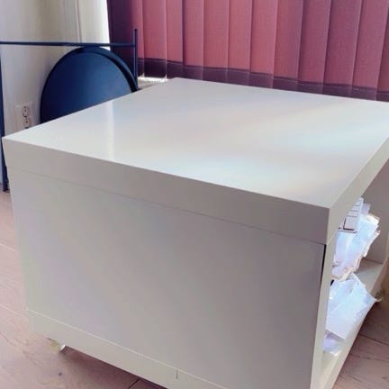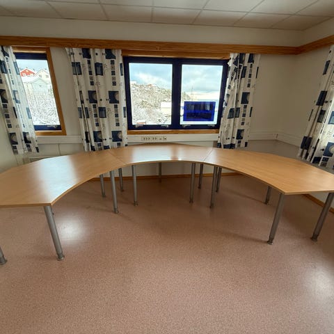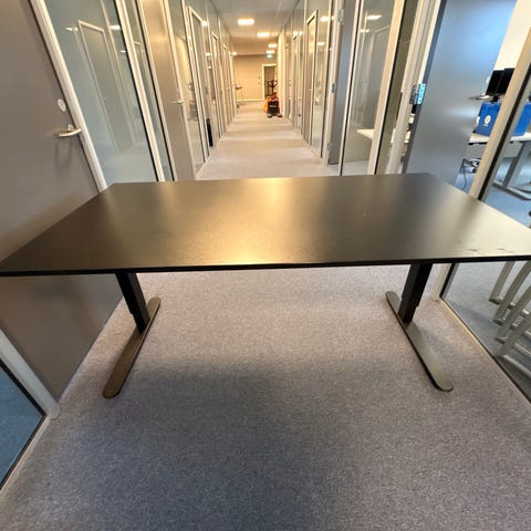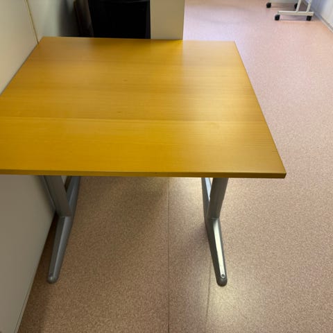 Skrivebordet er i relativt god stand, med unntak av et lite hakk i bordplaten.