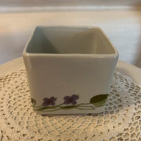Figgjo - Kirsten dekor Saturn. krukke med lokk i keramikk med blå dekor. Passer til oppbevaring av små gjenstander eller som del av servise. Hvitt underlag med blå mønsterdetaljer rundt hele krukken og på lokket.