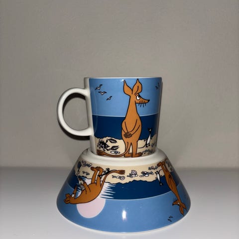 Arabia Mummi kopp og skål i motivet «Too-Ticki». Har små merker etter vanlig bruk.