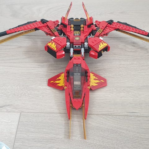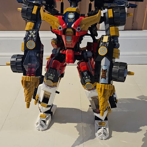 Skikkelig kul Ninjagolego. 4 mindre «roboter» som kan settes sammen til en stor. Selges ferdig bygget, med bruksanvisning men uten eske. Tilsynelatende med alle deler, men har ikke talt bitene. Selges som den er.
