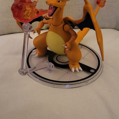 Pokemon Charizard figurine laget av plast i oransje farge. Figuren viser Charizard i en stående positur med utstrakte vinger og flammer rundt basen. Egnet som samleobjekt eller dekorasjon.