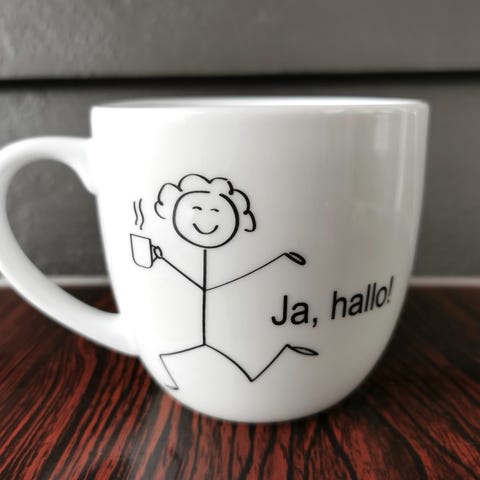 Skålens diameter er ca. 14 cm, og settet passer fint som liten kaffe- eller mokkakopp.