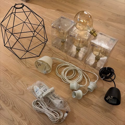 Jeg trodde jeg hadde kjøpt to pendler til vindu og tok begge utav esken og kastet dem før jeg så at det var til tak. De er derfor uten emballasje, men med skruer.