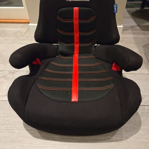 Sparco Sittepute/barnesete. Setet har svart stoff med røde detaljer og er designet for barn i gruppe 3 (22-36 kg). Det inkluderer armlener og koppholder, og materialet gir komfort og støtte under bilreiser.