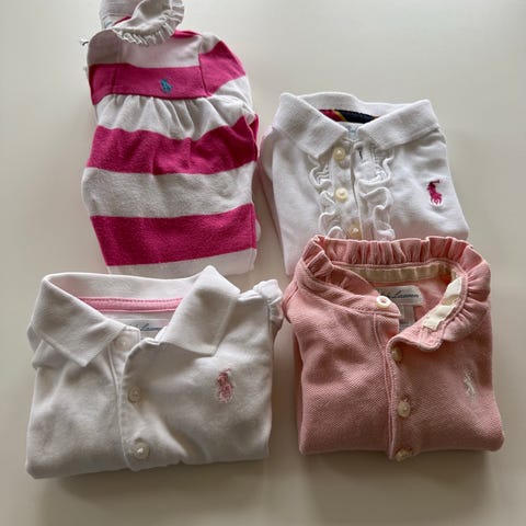 Polo Ralph Lauren klespakke i størrelse 3-6 måneder, unisex. Klassiske fine plagg som passer like godt til jente som gutt. Rompers, med lange og korte ben, t-skjorter, solhatt som kan brukes på begge sider (helt ny), ubrukt body med brodert mønster på kragen, baby lue og joggebukse.