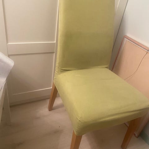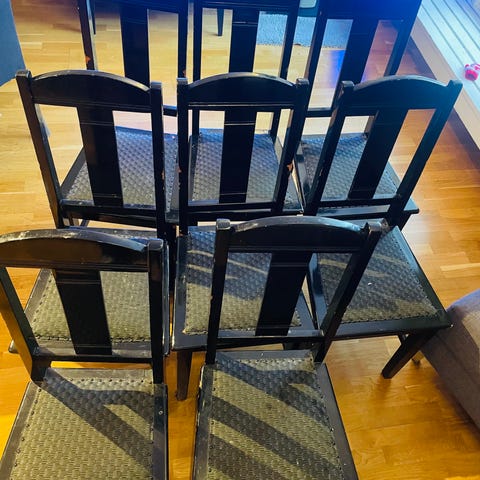 Godt brukt, men mye bord og stoler igjen. Har ikke ileggsplate til bordet. Flekk på ene stolen, se bildene. Produsent av stolene er Licentia Møbler A/S i Danmark. Bordet vet jeg ikke noe om. Trenger en vask. Gis bort på grunn av flytting.