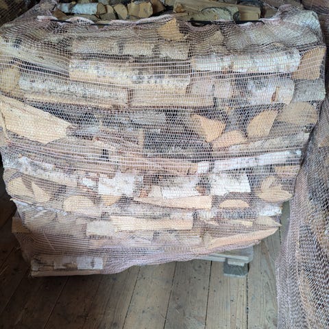 Bjørk i 40 liter sekk som er lagret inne.