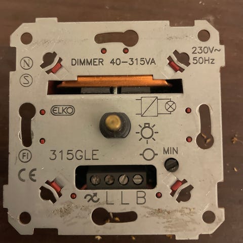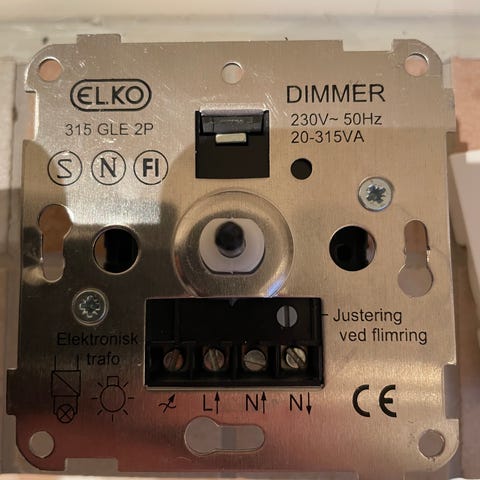 Elko 400GLJ lysdimmer med justerbar lysstyrke og av / på. Passer til standard veggbryterrammer. Juster skrue. Spenning 230V, maks belastning 400W. Pris samlet 2 stk.