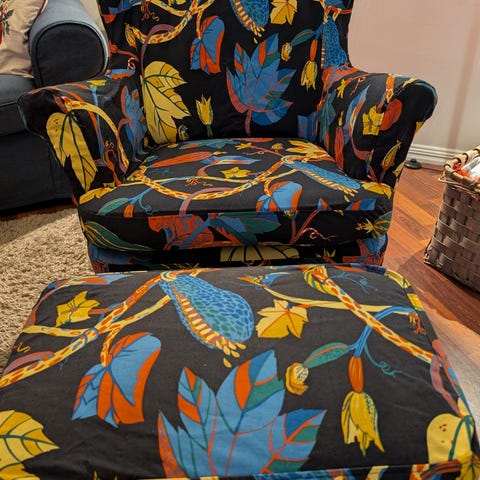 2 sett med Strandmon stoler med fotskammel selges