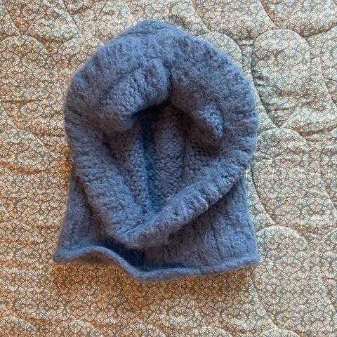 Balaklavaen er kremfarget og har justerbar snøring ved åpningen.