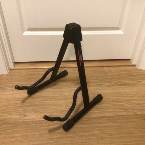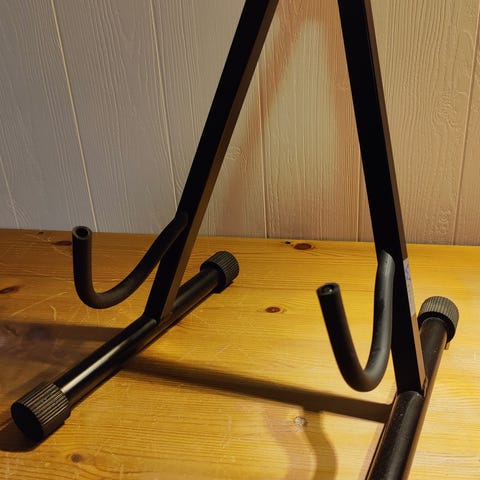 Gitarstativ for gitar. Stativet er laget for å holde gitarer sikkert og stabilt. Passer til ulike typer gitarer og er utstyrt med støtte for både kropp og hals på gitaren.