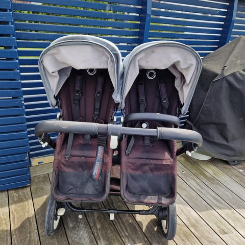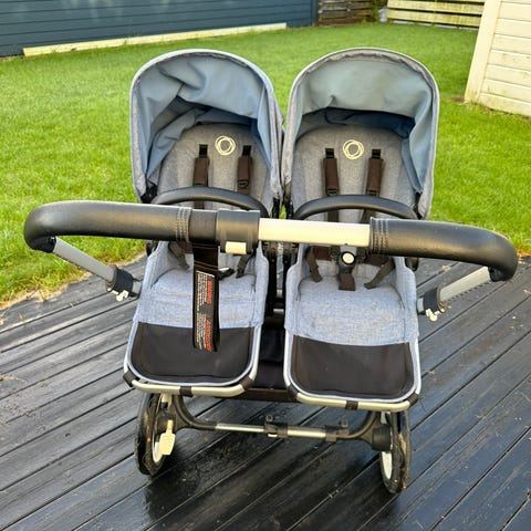 Bugaboo barnevogn med grå tekstil, inkludert to seter, en liggedel, to regntrekk og oppbevaringskurv. Vognen har justerbart håndtak, sikkerhetssele og solskjerm til begge seter / liggedel. Gir mulighet for komfortabel transport både sittende og liggende.