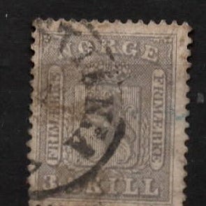 Norge frimerke med verdi 4 Skilling i blå farge. Motivet viser et løvesymbol. Stempelmerke brukt i 1863. Sendes som vanlig brev (billigst)