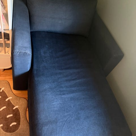 Pent brukt sofastol med praktisk lagring under. Har stått i solrikt vindu, og er derfor litt solbleket noen steder.