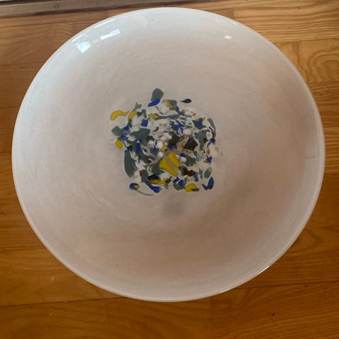 Hadeland Glassverk (eller Magnor?) glassbolle og glassfat i rubbet glass med uregelmessig form og bølget kant. Settet har en dekorativ struktur som gir et unikt utseende. 200,- for begge samlet. 125,- hver for seg.