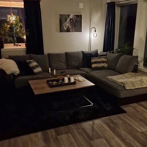 Sort hjørnesofa i skinn med plass til flere personer. Selges grunnet flytting. Sofaen er pent brukt og godt vedlikeholdt. Ingen synlig slitasje. Har stått i røyk- og dyrefritt hjem.