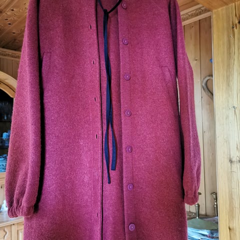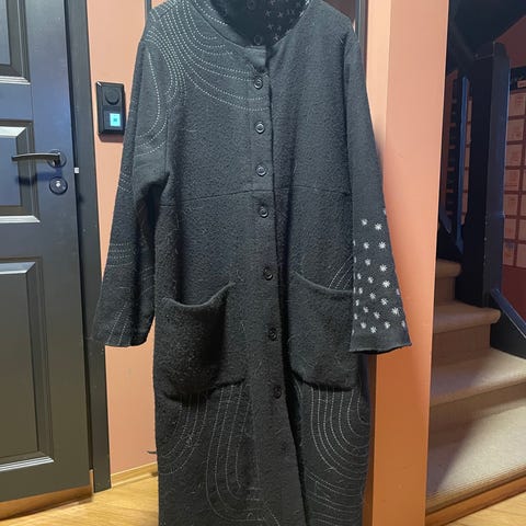 Lang, jacquardvevd kåpe med et stort og flott mønsterbilde. Modell med ståkrage og splitt bak, med omvendte farger på mønsterbildet som gir en fin effekt. Helfôret med ensfarget fôr, metallknapper med kontrastfarget tråd og lommer i siden.