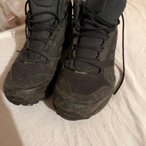 Adidas Fottur sko i størrelse 44, designet for fottur. Skoene har en slitesterk yttersåle med godt grep, egnet for utendørs bruk. Fargene er hovedsakelig grå og svart med detaljer i hvitt og oransje. Materialene gir støtte og komfort for foten under turaktiviteter.