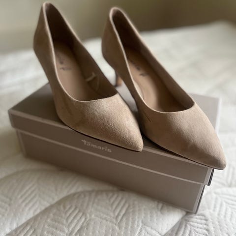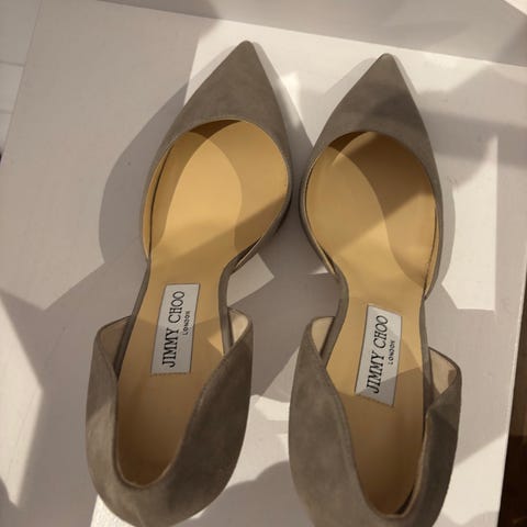 Delikated, semskede Jimmy Choo pumps. Lys beige i fargen balletpink. Modell Romy 60. Selges for 3000. Lite brukt.