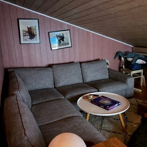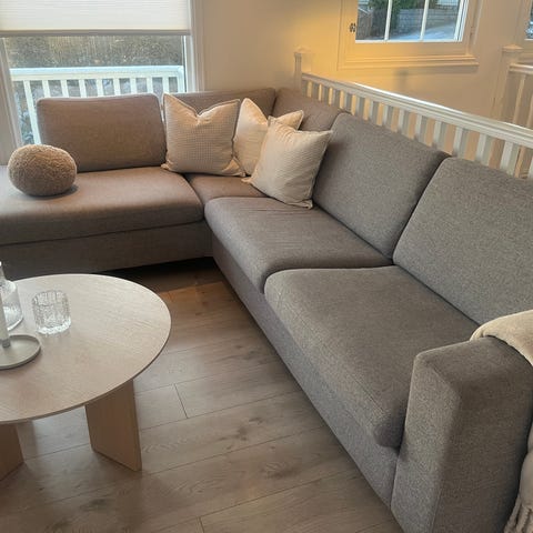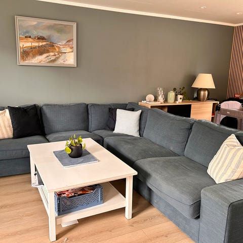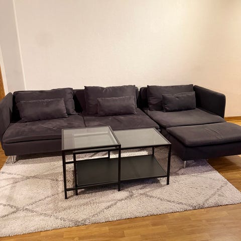 Sofa og puff fra IKEA (muligens Kivik) fra 2010/2011. Veldig god og behagelig å sitte i, og er relativt lite brukt etter 2012. Har en flekk (brus) på sjeselongen som muligens kan fjernes (uvisst når denne er fra). Tror det er mulig å bytte trekk på sofaen, men skal ikke si noe sikkert.