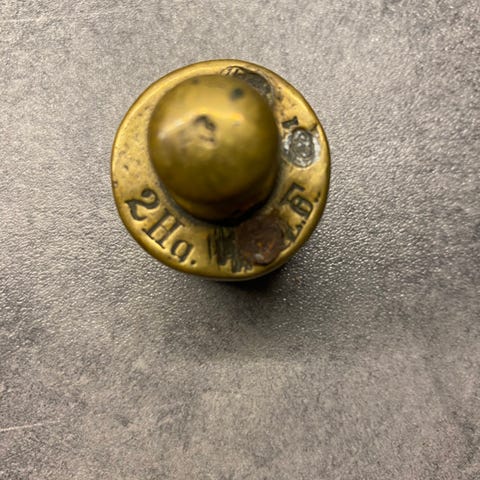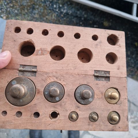 Sett med 11 vektlodd i messing fra 1 til 200 gram.
