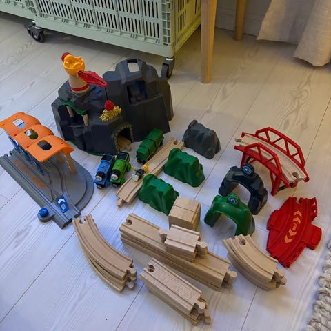 Stort BRIO Togsett inkludert ulike skinner, broer, tog og tilbehør. Settet leveres med en blå oppbevaringskoffert for enkel lagring og transport. Passer for barn og gir mulighet for kreativ lek og bygging av ulike togbaner. Ca 150 deler til sammen.