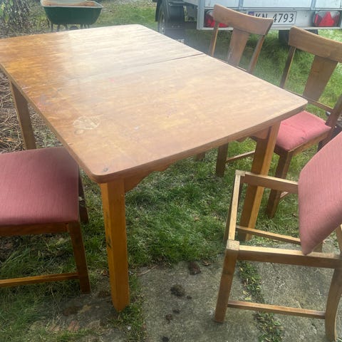 Retro spisestue med fire stoler. To illeggsplater, kan trenge litt mer olje på toppen. Har gjort noe med godt resultat. Stolene er forsterket med en ekstra skrue. Blått trekk i femtitalls stil. Nett størrelse, utenom bordplata i svært god stand, men trenger altså bare litt mer stell. Må hentes på Frogner.
