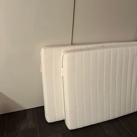 De er brukt i kanskje 1 år, har stått i kjellerbod de siste 8 årene. Trekket trenger en god vask.
