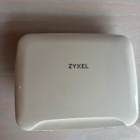ZyXEL P-2812HNU-F1 router med flere LAN-porter og hvit plastkapsling. Enheten har indikatorlys for status og tilkoblinger, samt tilkoblingsporter for nettverk og strøm.
