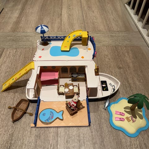 Selger svært pent brukt Sylvanian Family hytte ved sjøen, campingbil, familiebil og ekornfamilie. Fiskestangen som hører til campingbilen er knekt og reparert med tape.