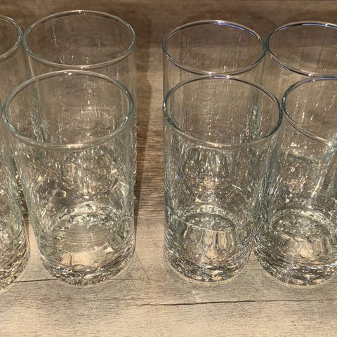 8 stk. enkle, pene glass. Høyde 9,8 cm, dia 5,5 cm (rette). Selges grunnet plassmangel. Selges samlet totalt kr 200.