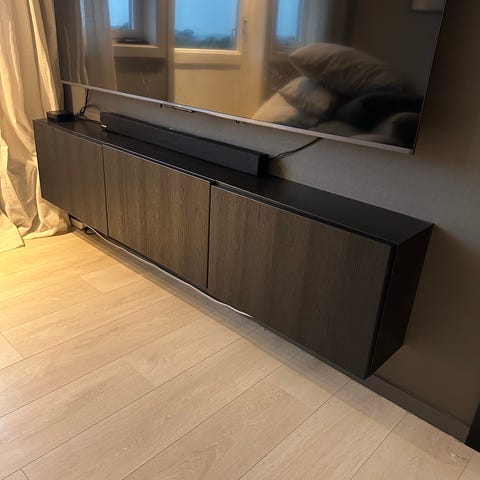Pent brukt. Det er et dobbelt med vitrinedører, et enkelt med vitrinedører og et dobbelt skap i halvhøyde med tette skapdører.