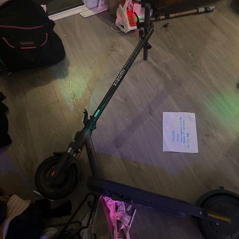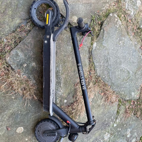 E-wheels elsparkesykkel kjøpt 2023 selges som dele-elsparkesykkel eller reparasjonsobjekt. Som det fremgår av bildene har den fått seg en trøkk på en fortauskant, men fungerte utmerket frem til det. Antar den kan repareres greit for noen som er hakket mer nevenyttig enn meg (og det skal ikke mye til.)