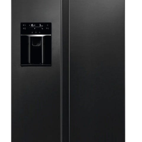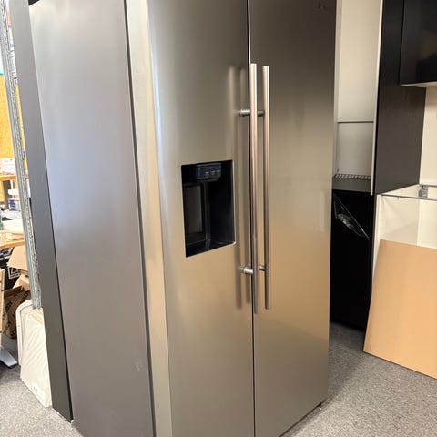 Hisense Side-by-Side kjøleskap med dobbel dør, egnet for oppbevaring av mat og drikke. Kjøleskapet har flere hyller og dørrom for organisering av ulike matvarer. Den smale døra som det henger bare ark på om magnet merket er fryser og den døra hvor det står sånn skole skilt på er kjøleskap jeg skal ha 6500kr. for Side by Side kjøleskapet jeg betalte 10.000 for et år siden kjøleskapet blir litt for stort for meg så jeg skal kjøpe meg et mindre så derfor selger jeg det for 6500 kr. løp og kjøp