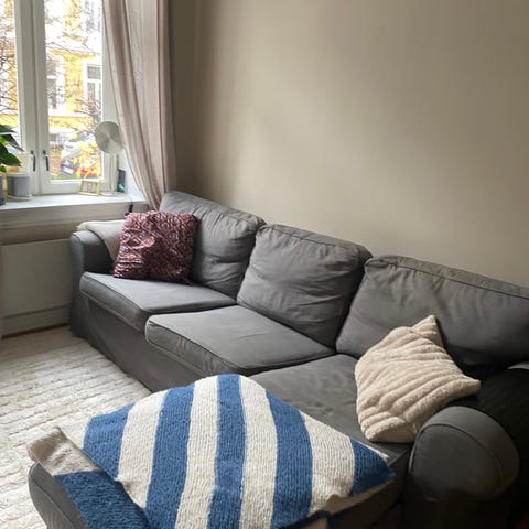 Grå hjørnesofa fra Bohus selges. Sofaen er ti år gammel, men er god å sitte i.