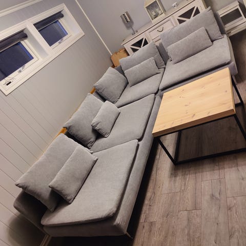 Sofaen kommer i to deler. Sjeselongen kan tas av.