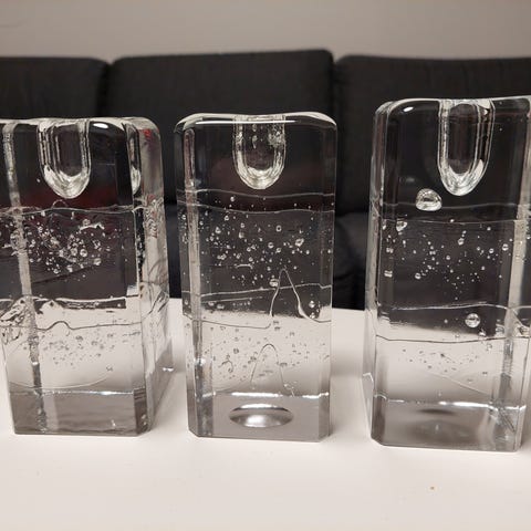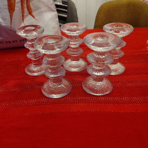 Iittala Festivo lysestaker laget av klart glass med teksturert overflate. Settet består av to lysestaker i ulike størrelser. 3 ringer ca 15 cm og 1 ring ca 8 cm.
