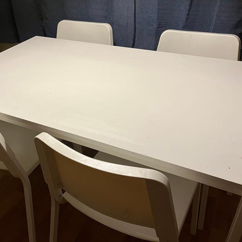 Beina og tverrliggerne er plukket av så lettere å frakte. Bordet blir ca 45 cm lengre når det foldes ut