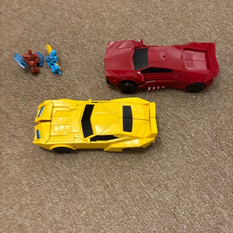 Sett med flere Transformers leker i ulike farger og modeller. Lekene inkluderer flere figurer med forskjellige former og størrelser, laget av plastmateriale. Passer for barn som liker robot- og actionfigurer.