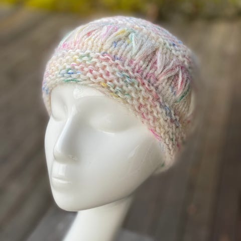 Fin strukturstrikk i pannebåndet, og det sitter godt på.