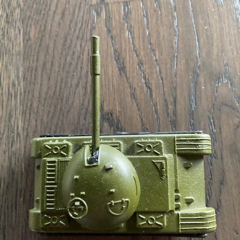 Selger en leketøystridsvogn i støpt plast, sannsynligvis inspirert av M47 Patton-tanken.