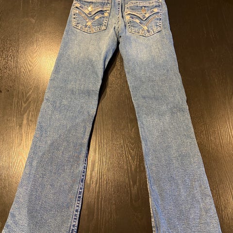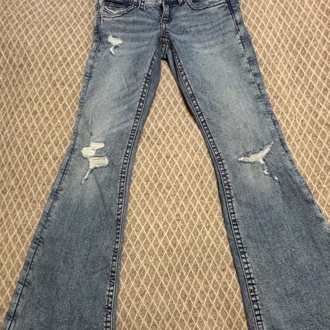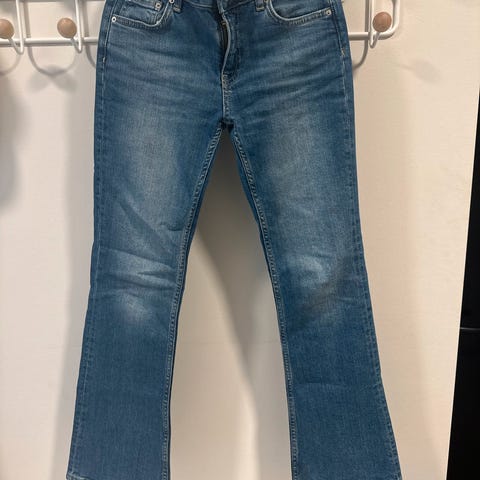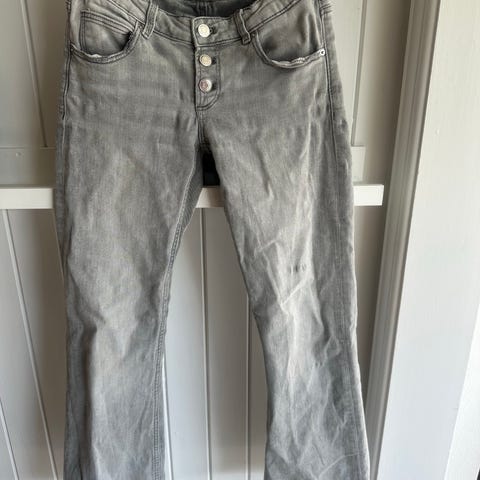 Flare-jeans med broderte baklommer. . De har utsvingte ben, lav stretch, lynlås og frontlommer.