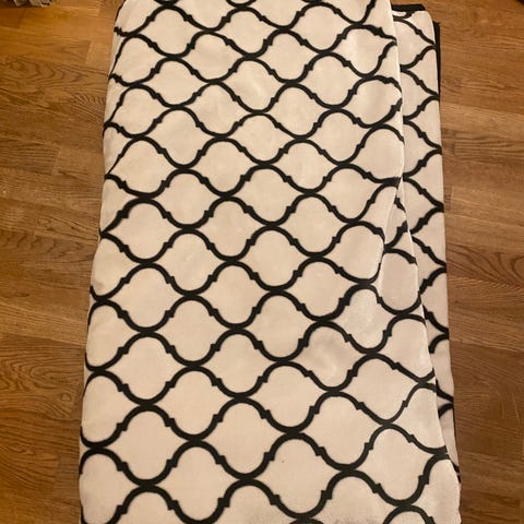 Teppe/ Fleecepledd med stor blomsterdesign i røde, rosa og burgunderfarger.